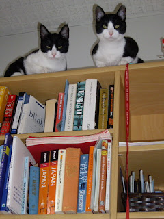 * The kittens have suddenly started scaling the ceiling-to-floor net that is meant to stop them falling into the stairwell and down into the kitchen and Okaasan's life. They scramble up it every 3 minutes when the hormones are particularly racing. * And Chichi managed to jump from the printer TO the top of the bookcase finally and attack all the wintering houseplants. * And they've been waking up at 4.30 am......