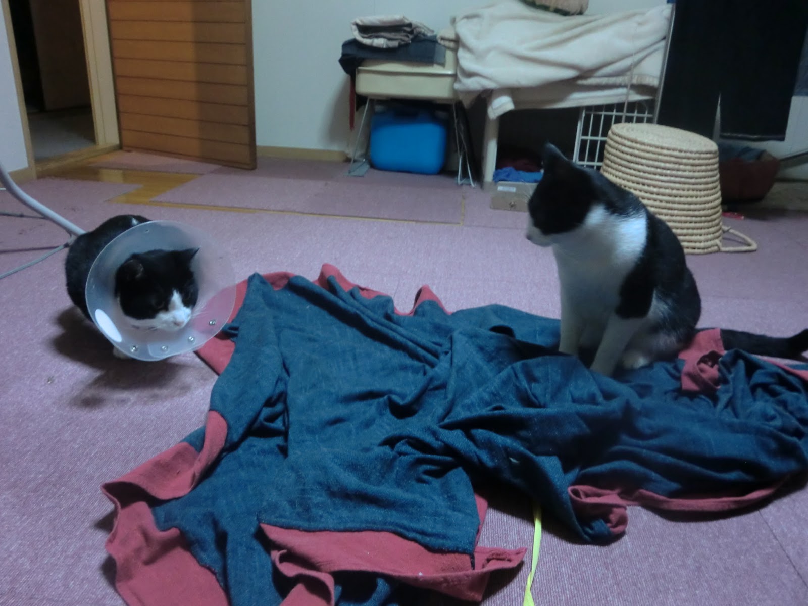 * and cats....major jealousy/bullying going on between Chichi and Popo. Tonight they finally sat down near eachother. The plastic collar scares Chichi and he stayed out 2 nights, while we had to close all the windows and doors to keep his injured brother in.
