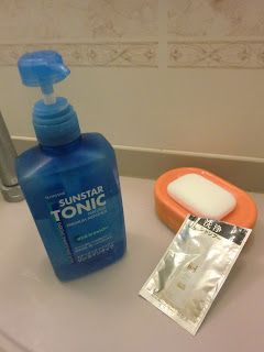 Yujiro solved it all today: he dug out our store of hotel and magazine sample shampoo sachets. You know - the stuff we all steal from hotels and in drugstores.